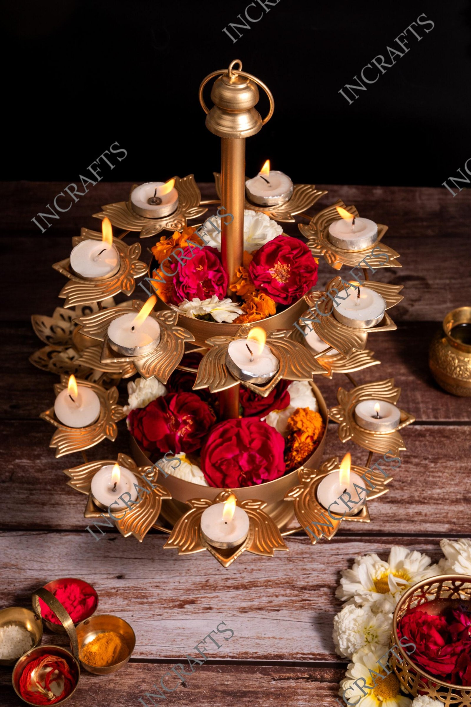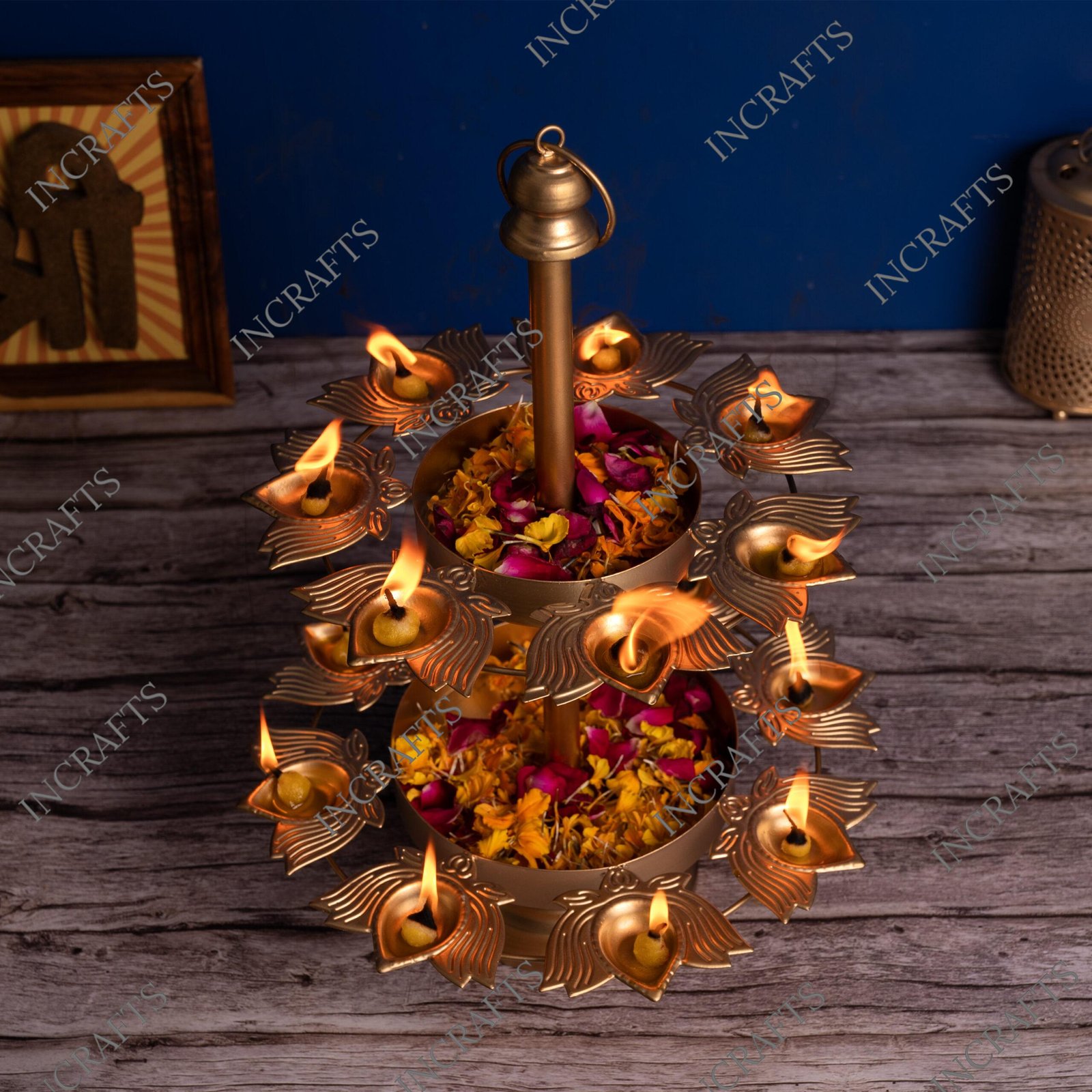 KASHFI LAYER KAMAL DIYA URLI STAND- Diya Urli Stand at best prices. If you are looking forward to light up many diyas in a royal stlye, opt for this diya urli stand For the simple reaason that ihas a double layer with plenty of diyas with a stand. Fill up beautifully designed diyas with mustard oil to light it up while jasmine flower petalsin the middle of the diay urli with stand to complete the decoration. It is a complete diya urli which doesn’t leave room for any incomplete decor. Aesthetifcally designed, this multiple layer Iron diya urli with stand with made of premium quality iron crafted by the experienced local artisans for durability and amazing design.