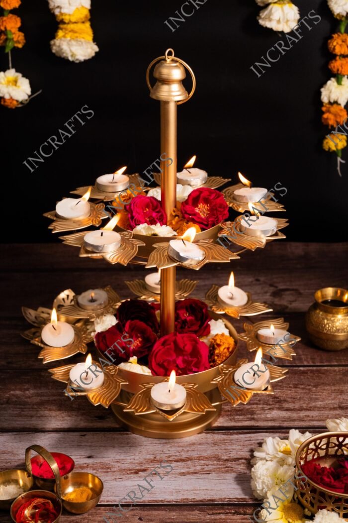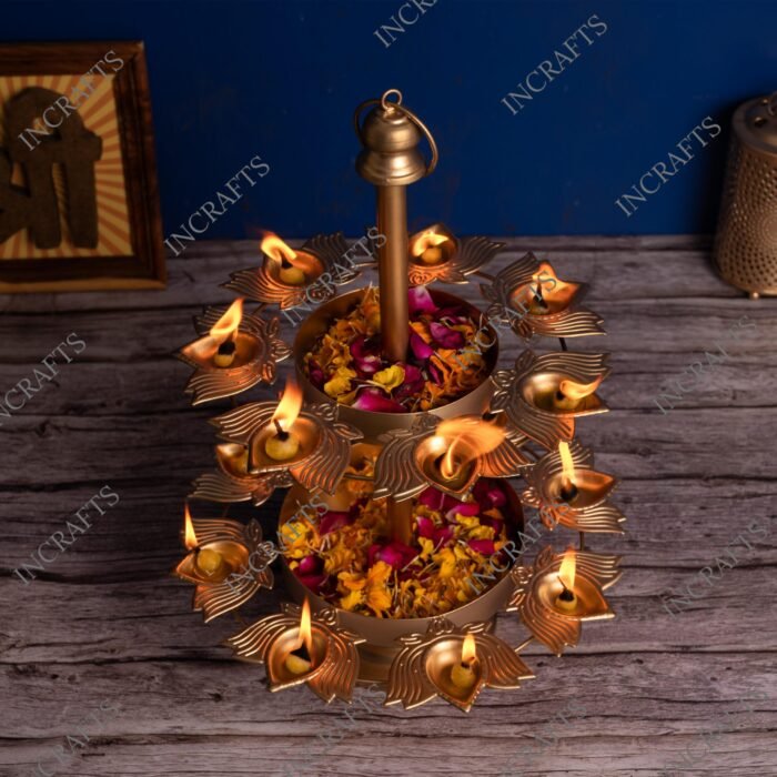 KASHFI LAYER KAMAL DIYA URLI STAND- Diya Urli Stand at best prices. If you are looking forward to light up many diyas in a royal stlye, opt for this diya urli stand For the simple reaason that ihas a double layer with plenty of diyas with a stand. Fill up beautifully designed diyas with mustard oil to light it up while jasmine flower petalsin the middle of the diay urli with stand to complete the decoration. It is a complete diya urli which doesn’t leave room for any incomplete decor. Aesthetifcally designed, this multiple layer Iron diya urli with stand with made of premium quality iron crafted by the experienced local artisans for durability and amazing design.