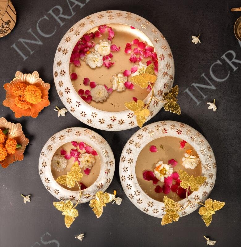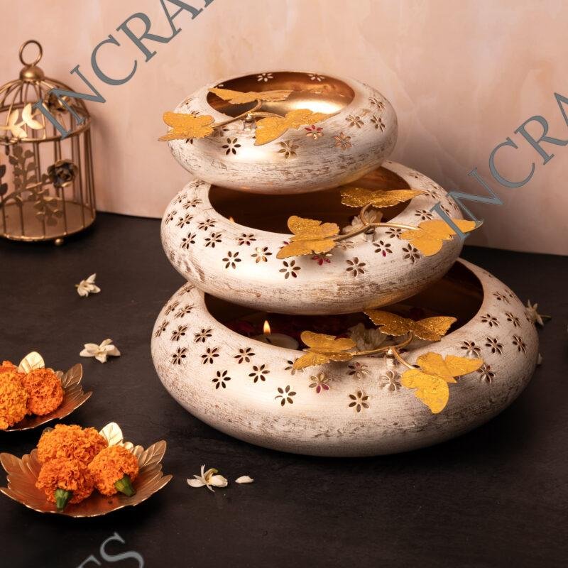 Ambra Rangoli- You need candle stands to complete the home decor in the true sense.Decorative candle holder is made of metal and strives to achieve a great balance between Indian and modern aesthetics. The golden tealight holder has stands in the shape of flowers and urlis that can hold multiple tea light candles together, giving a stunning glow. The holder can be placed on the mantlepiece or console table. It can be kept in any corner of your home to add an element of decor and brighten up the mood at festivals and special occasions. The tealight holder can be a centerpiece for a perfect table setting while hosting a dinner.