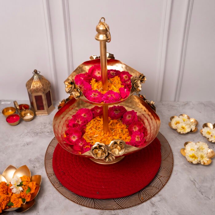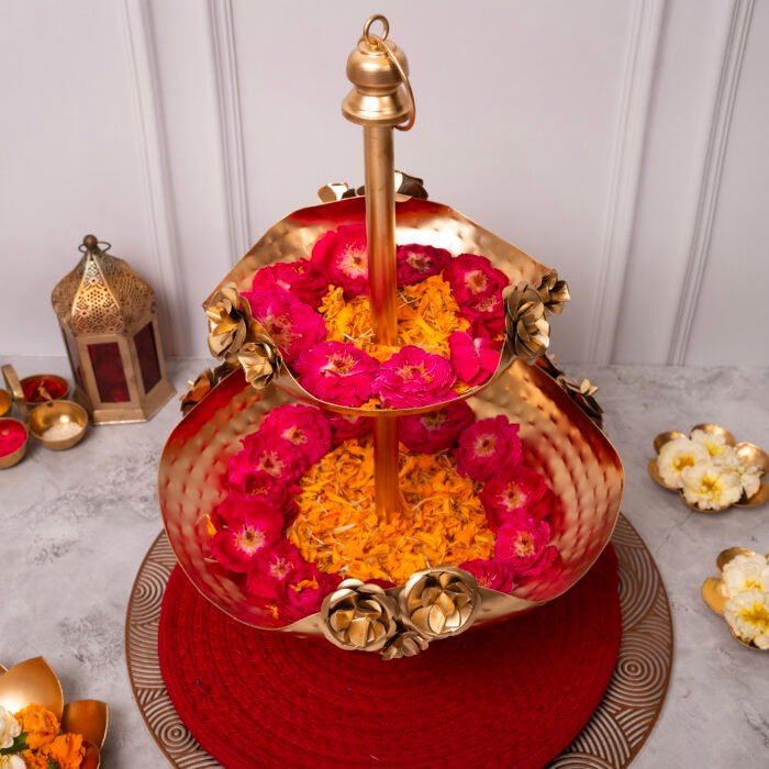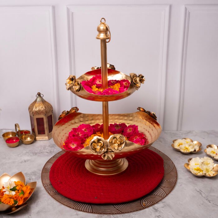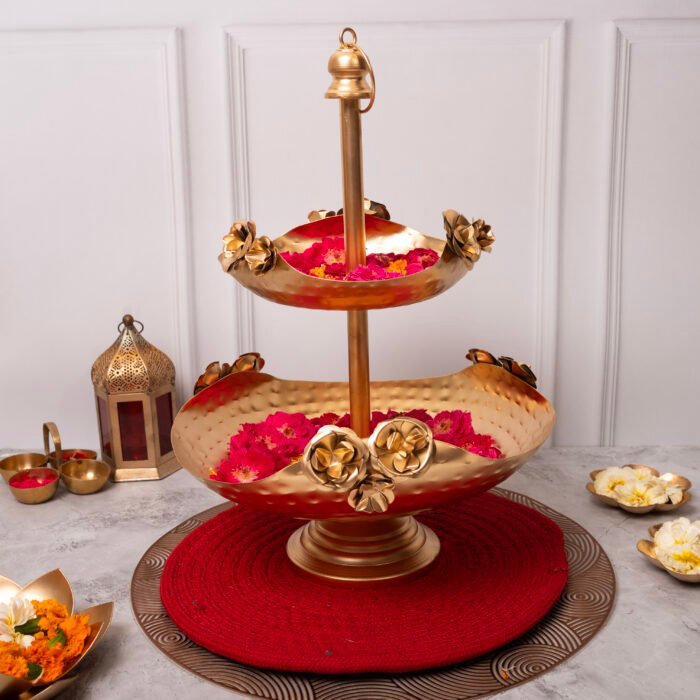 Ibra 2 Layer Rose Floral Urli- Bring a touch of elegance and charm to your home with our Gold stand Urli . This exquisite decor piece is made of sturdy iron and features a beautifully crafted floral design in a soothing gold hue. Perfect for displaying flowers, floating candles, or potpourri, Whether you want to give your living room, bedroom, or office a sophisticated look, this piece is a must-have for any discerning homeowner. Get yours today!