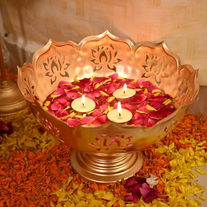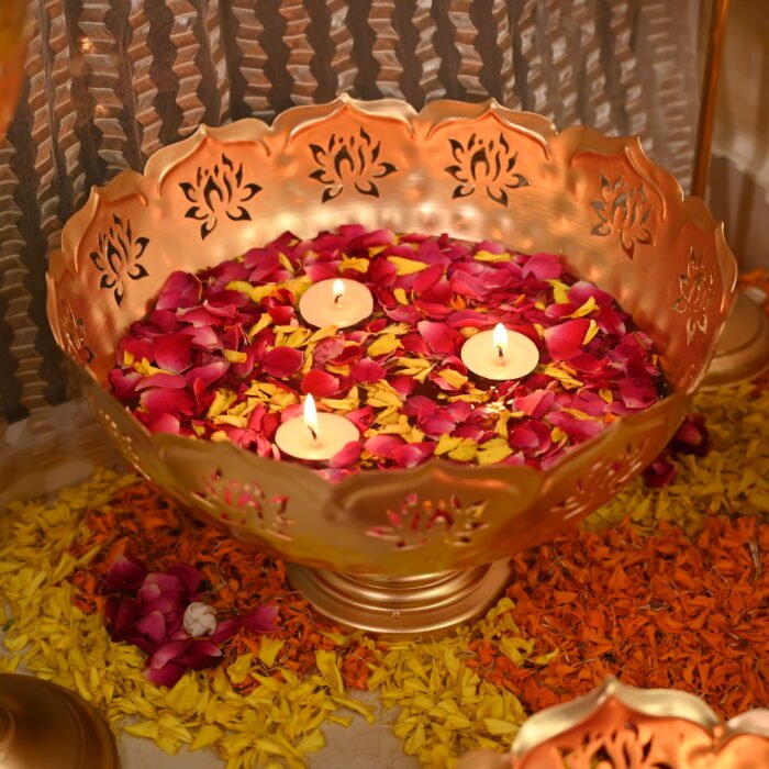 Sunehri lotus design se sajaa hua urli, jisme gulab aur genda ke pankhudiya roshni se milkar ek divya aur shantimay aura banati hain.