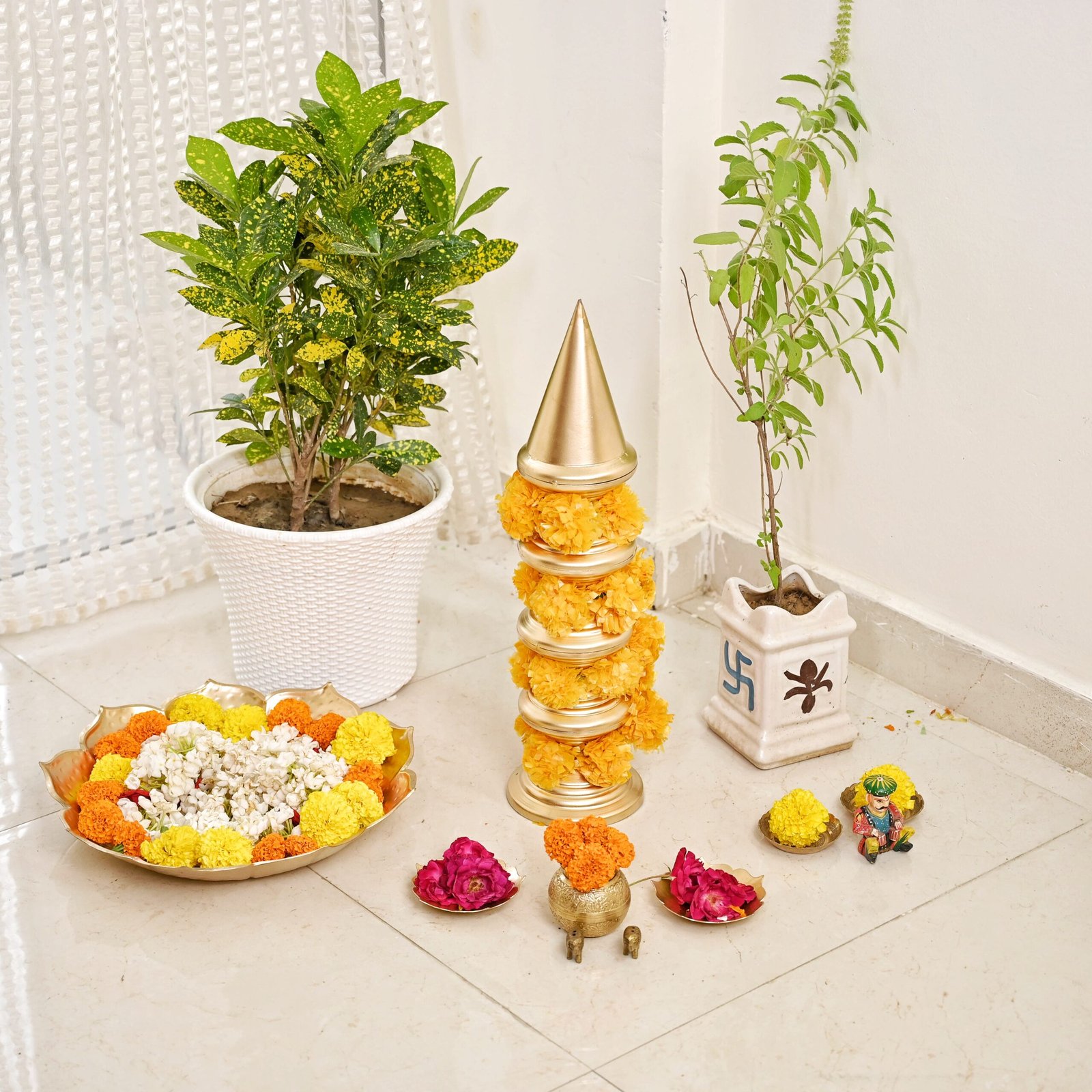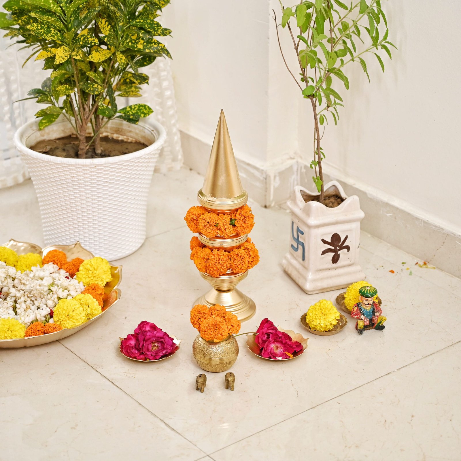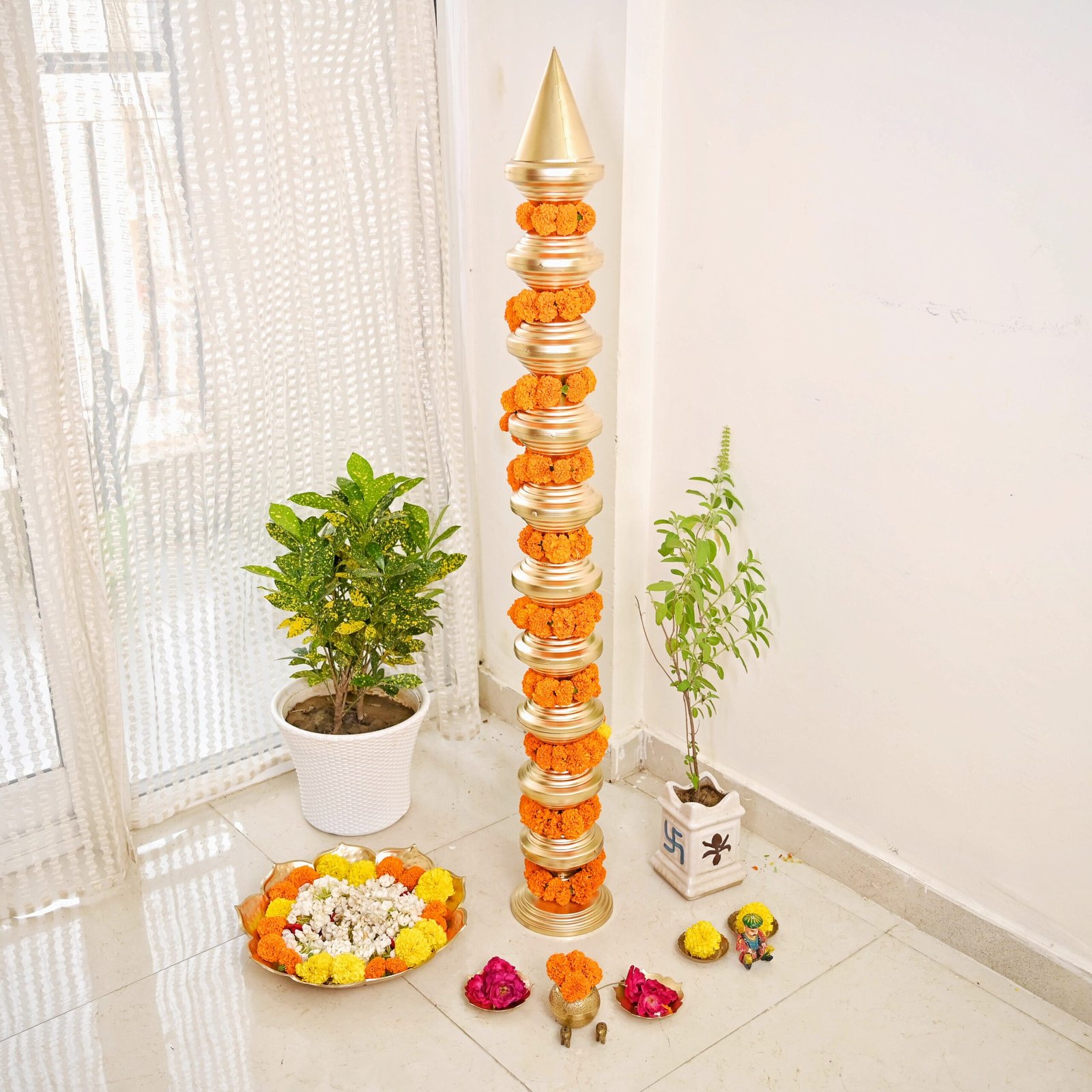 Add a royal and spiritual charm to your space with the Mandir Shringar Stambh. Inspired by traditional temple architecture, this golden pillar is designed with multiple tiers that can be beautifully adorned with flowers, garlands, or lights. The pointed top adds to its sacred look, making it an auspicious piece for pooja rooms, Tulsi vrindavan, and temple entrances.