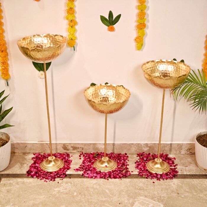 Bring timeless elegance to your space with the Meher Taj Bowl Stand Urli. Perfect for floating flowers, candles, or potpourri, this regal centerpiece blends traditional charm with royal sophistication. Its graceful standing design makes it an ideal décor accent for living rooms, entryways, or festive occasions.(can be dismantled)