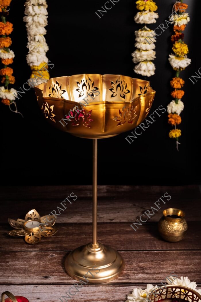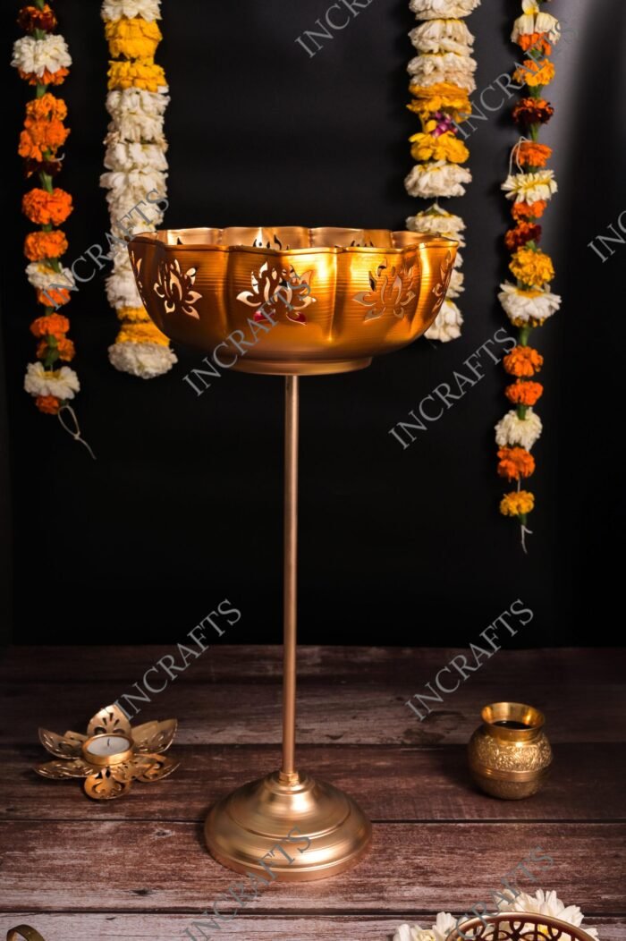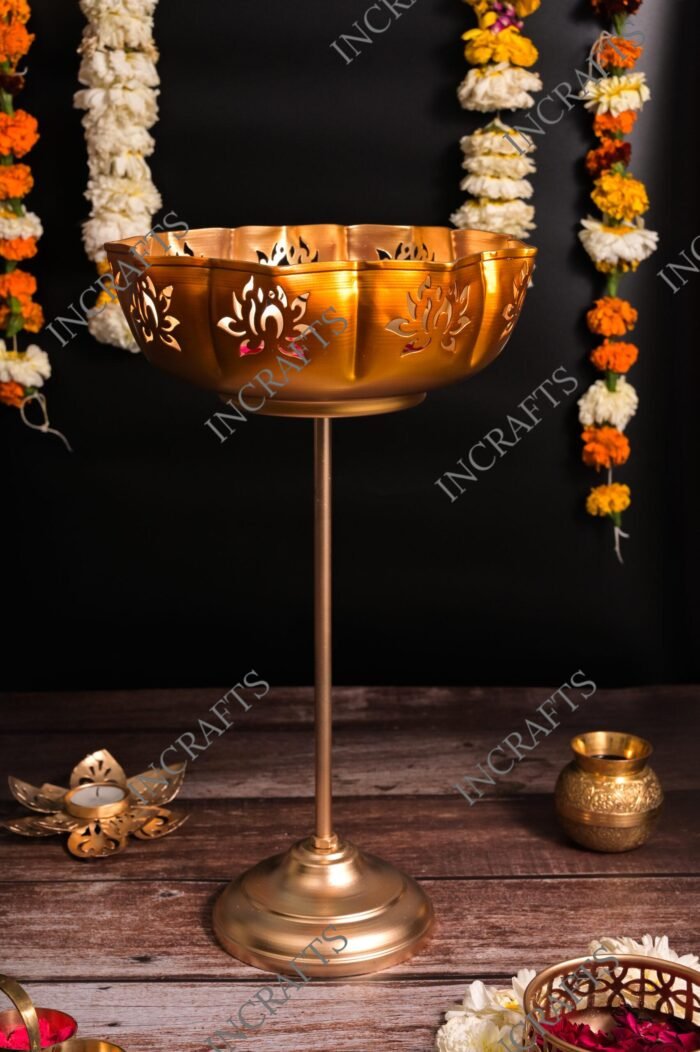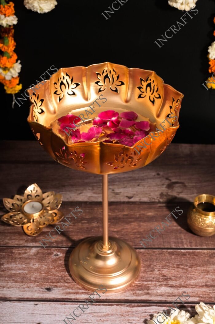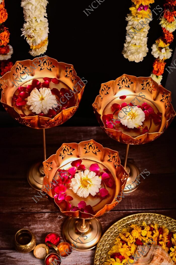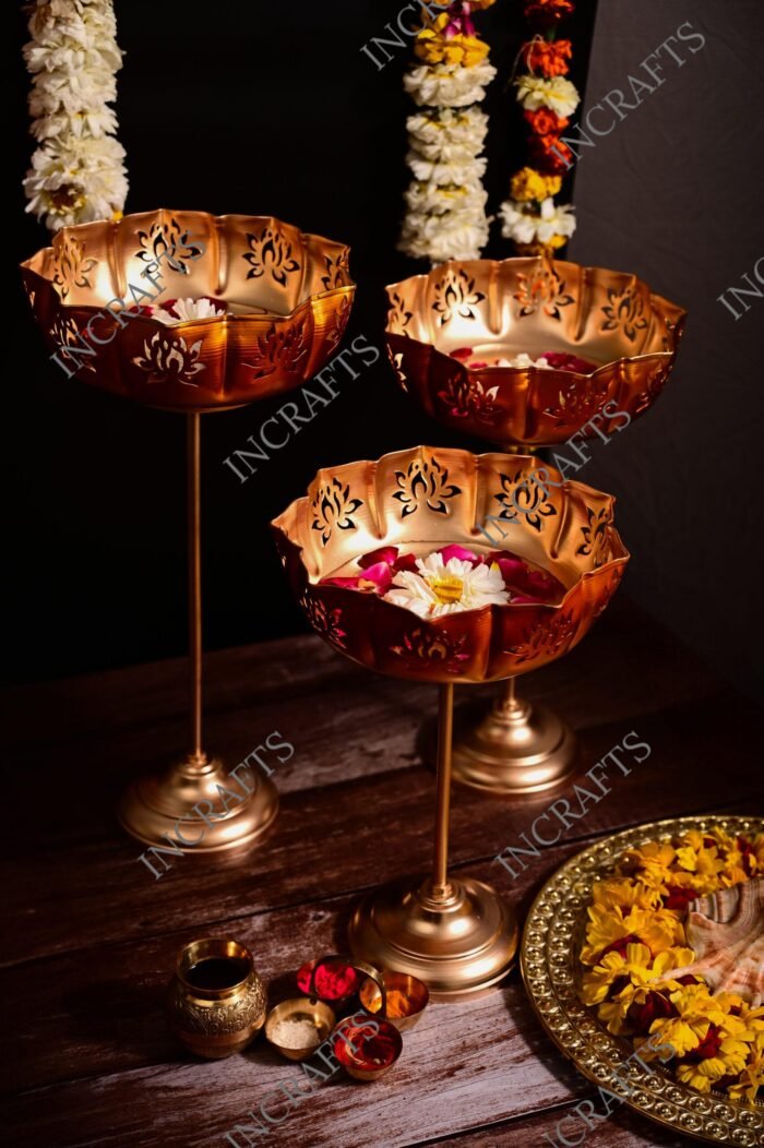 Standing Lotus Urli- Add a touch of luxury to your home today with the Standing Urli with Gold Finish. Elegantly crafted, this decor item will add a touch of glamour to your living space. The urli is made from high-quality metal with a radiant gold finish and a unique design. Its lotus shape is sure to capture the attention of anyone who enters the room. The finishing is neat and clean, enhancing the product’s overall appeal. Available in three sizes and sold in a set of three, the standing urli is perfect for displaying flowers, decorative items or simply as a standalone