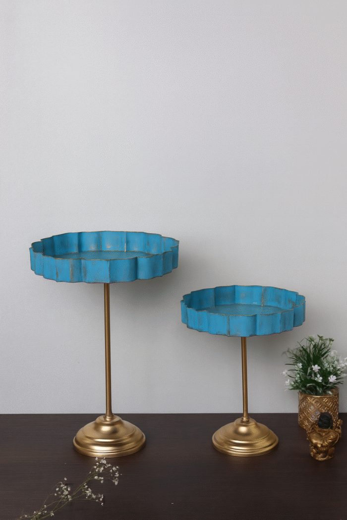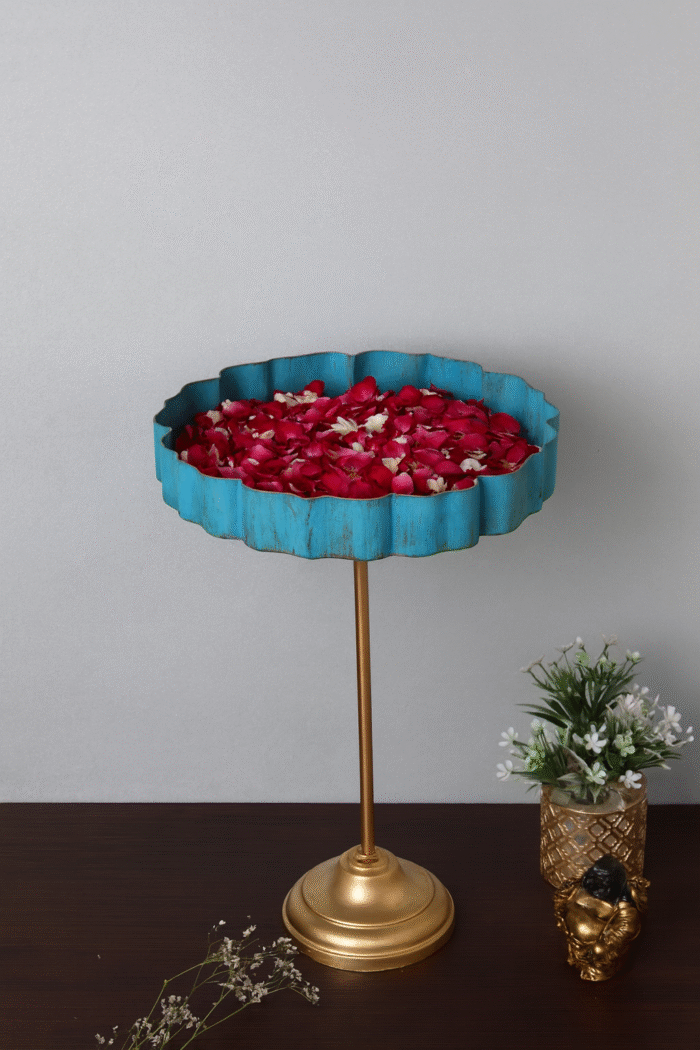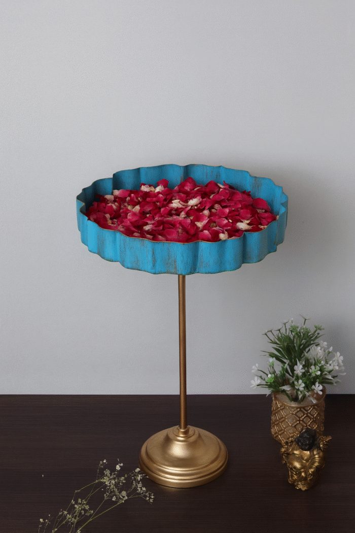 Standing Vatsal Urli -Add a touch of grace and elegance to your home decor with our Blue & Gold Urli with Stand. Crafted with care and precision, this urli features a appealing Puple Lotus design with intricate silver detailing, creating a beautiful contrast. The urli is made with durable iron material, ensuring longevity and sturdiness. The high-quality finishing adds a touch of finesse and charm, making it a great addition to any setting. Perfect for both indoor and outdoor use, this urli is sure to captivate the hearts of your guests. Order now and create an enchanting ambiance in your home or office.