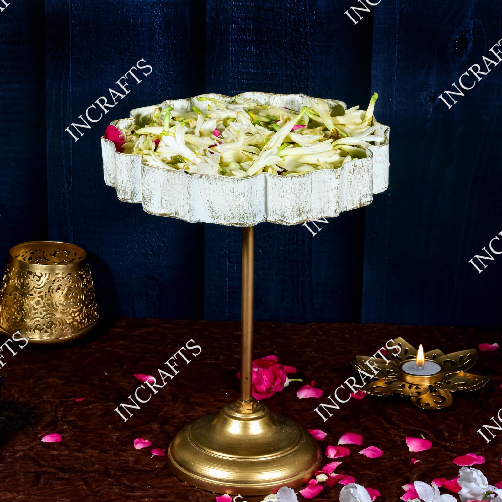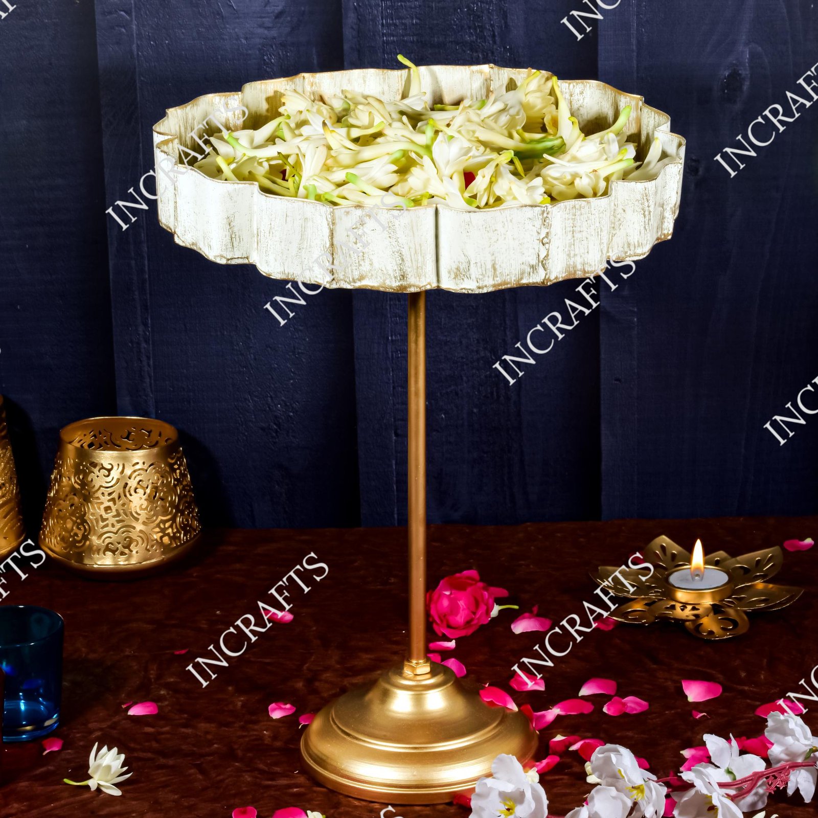 Standing Vatsal Urli -Add a touch of grace and elegance to your home decor with our White & Gold Urli with Stand. Crafted with care and precision, this urli features a appealing gold Lotus design with intricate silver detailing, creating a beautiful contrast. The urli is made with durable iron material, ensuring longevity and sturdiness. The high-quality finishing adds a touch of finesse and charm, making it a great addition to any setting. Perfect for both indoor and outdoor use, this urli is sure to captivate the hearts of your guests. Order now and create an enchanting ambiance in your home or office.