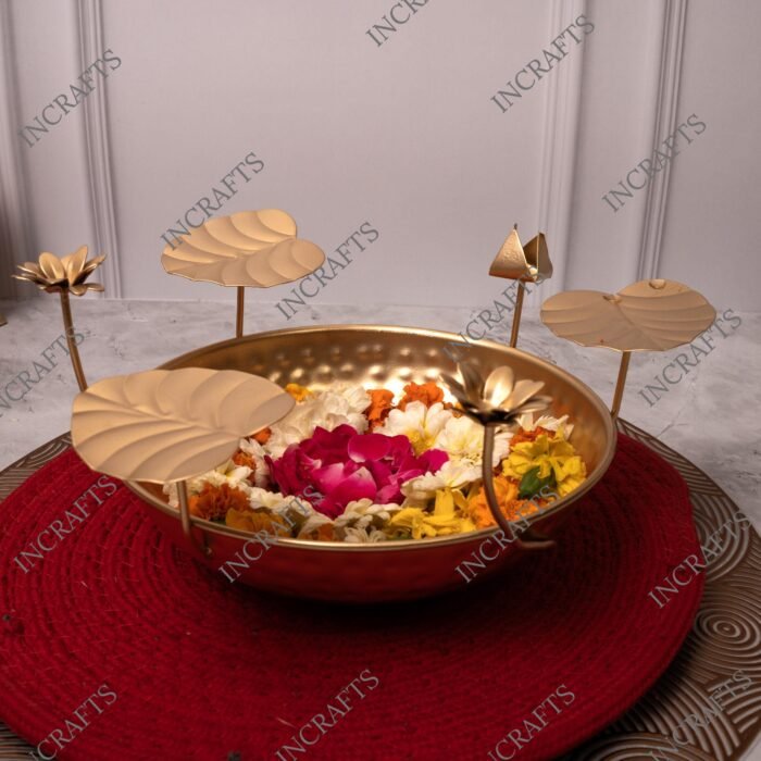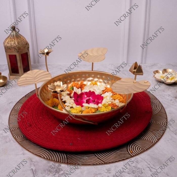 TEJASVI FLORAL URLI- Enhance the look of your home with the Luxury Gold Finish Lotus Urli. This beautifully designed urli exudes elegance and luxury with its silver finish and lotus shape. Perfect for decorating your living space or adding a touch of sophistication to any event.