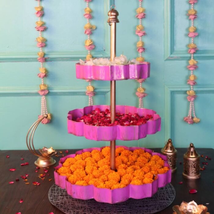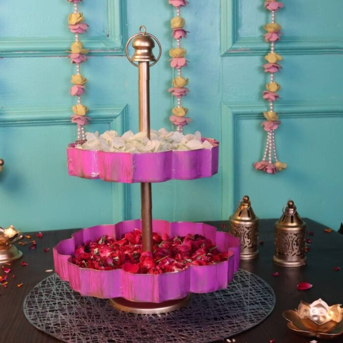 Use it like a decor stand by filling the layers with flowers and petals, and adding a few diyas OR use it as a dessert stand for your tea parties — place mithai, chocolates, cupcakes on both the layers!