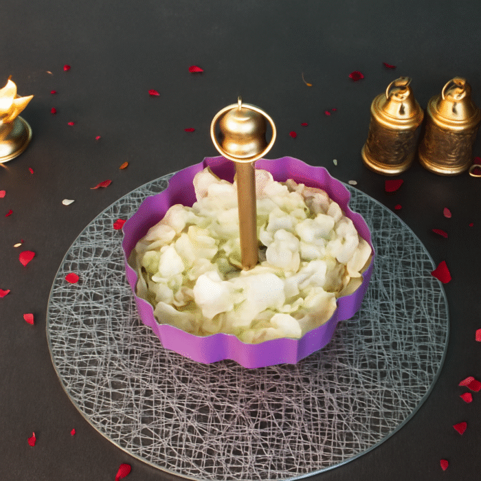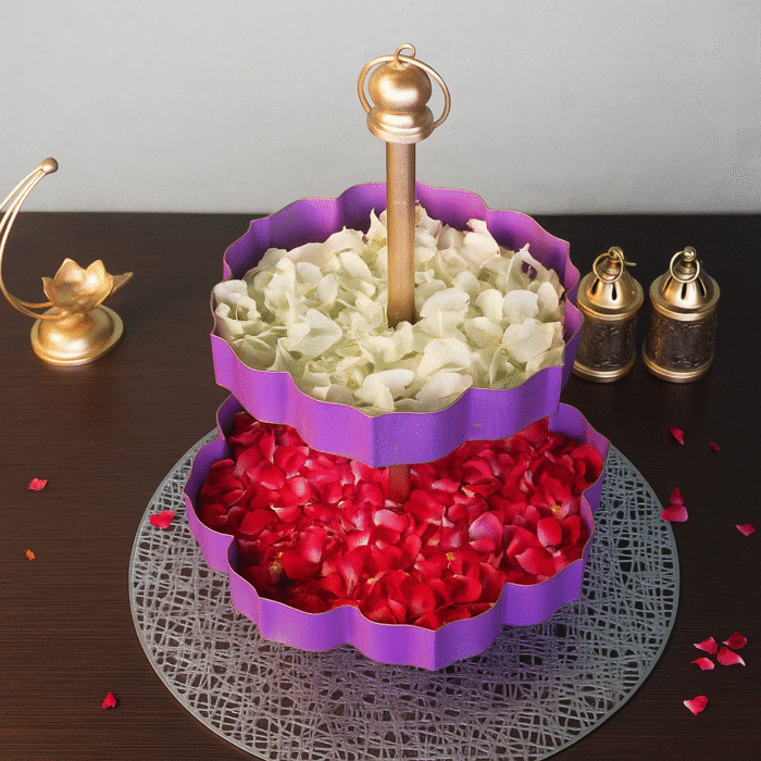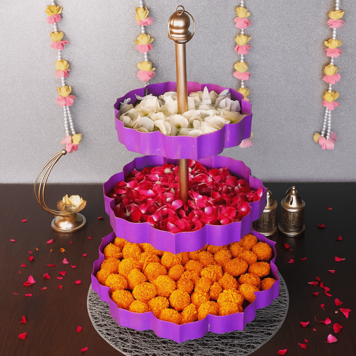 Use it like a decor stand by filling the layers with flowers and petals, and adding a few diyas OR use it as a dessert stand for your tea parties — place mithai, chocolates, cupcakes on both the layers!