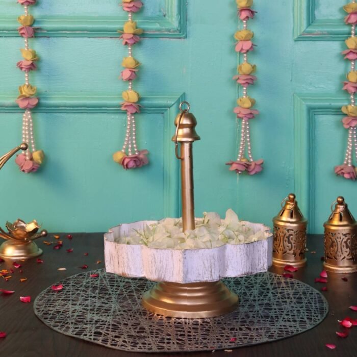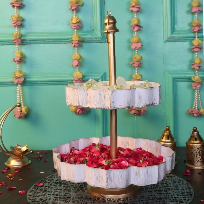 Use it like a decor stand by filling the layers with flowers and petals, and adding a few diyas OR use it as a dessert stand for your tea parties — place mithai, chocolates, cupcakes on both the layers!